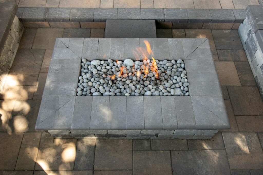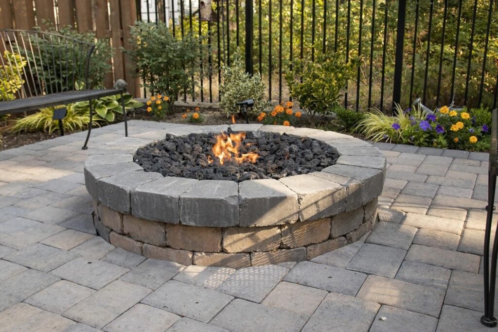 Gas fire pits operate differently. Whether using propane or natural gas, these fires burn cleaner and produce considerably less heat than wood. The flames are controlled and consistent, without the temperature spikes that stress stone and mortar. Ash isn’t a concern, and maintenance focuses mainly on keeping the burner clean. For gas fire pits, a liner provides minimal functional benefit beyond aesthetics if you prefer the look of a metal bowl.