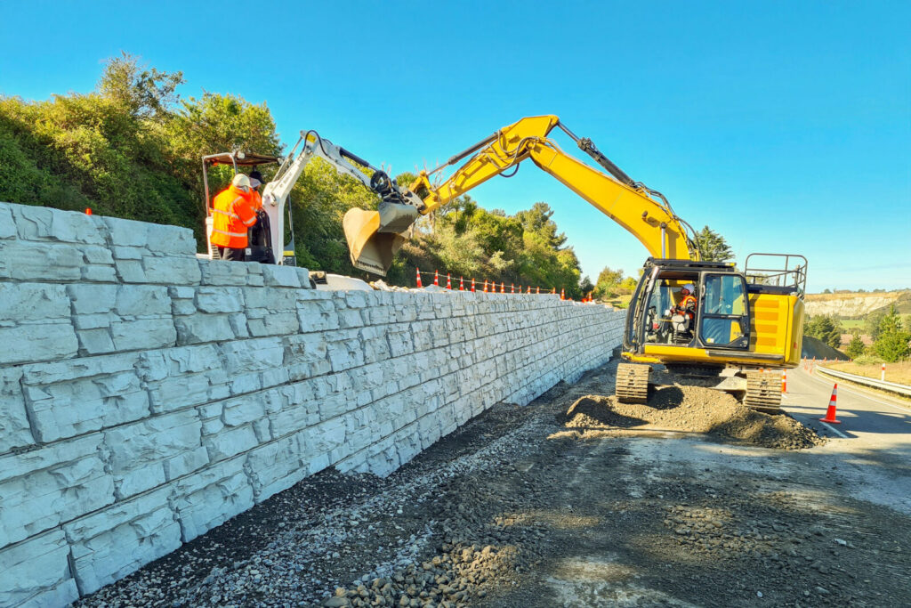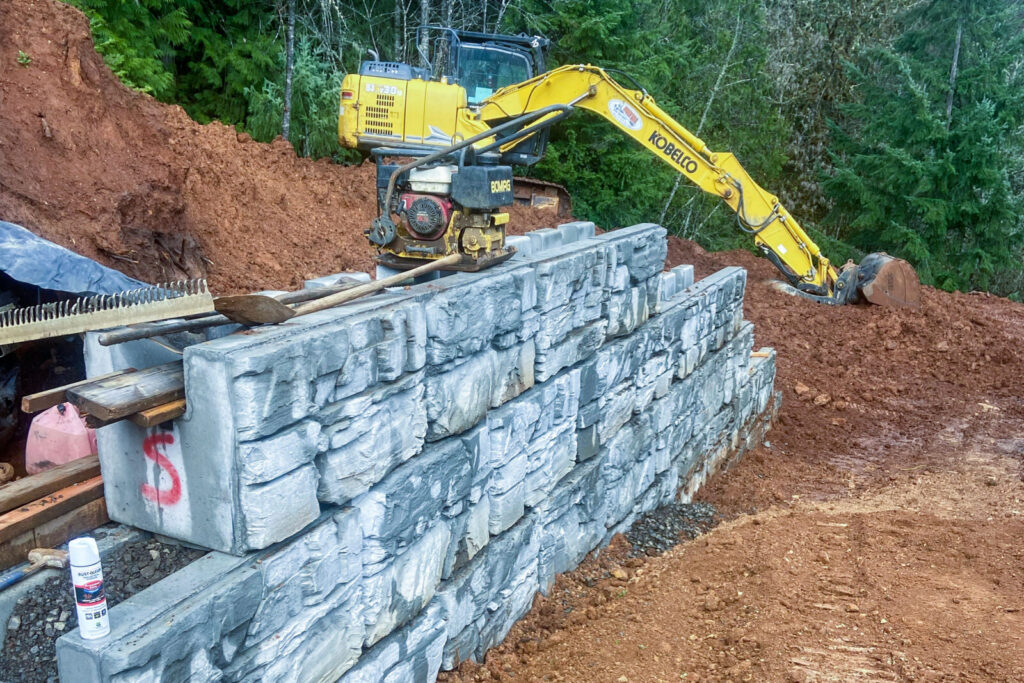MagnumStone makes gravity walls more accessible and easily installed. Eliminating the excavation time and labor that a standard retaining wall requires significantly reduces the time needed for installing MagnumStone. The lighter weight of MagnumStone makes for more nimble applications, with only a basic excavator or telehandler required to install them. MagnumStone usually only requires a couple of guys to work for a day on installation, instead of the much longer backbreaking labor of multiple men that standard gravity wall block would demand.